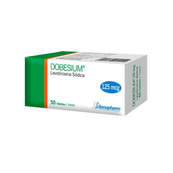 Dobesium 125 mcg x 50 tabletas contiene levotiroxina sódica, que actúa como hormona tiroidea de reemplazo en pacientes con función tiroidea disminuida. Es útil en casos de hipotiroidismo primario, después de tiroidectomía, en pacientes con bocio, y para suprimir la función tiroidea en ciertos tratamientos. Debe ser usado bajo supervisión médica con monitorización de TSH y hormonas tiroideas.
