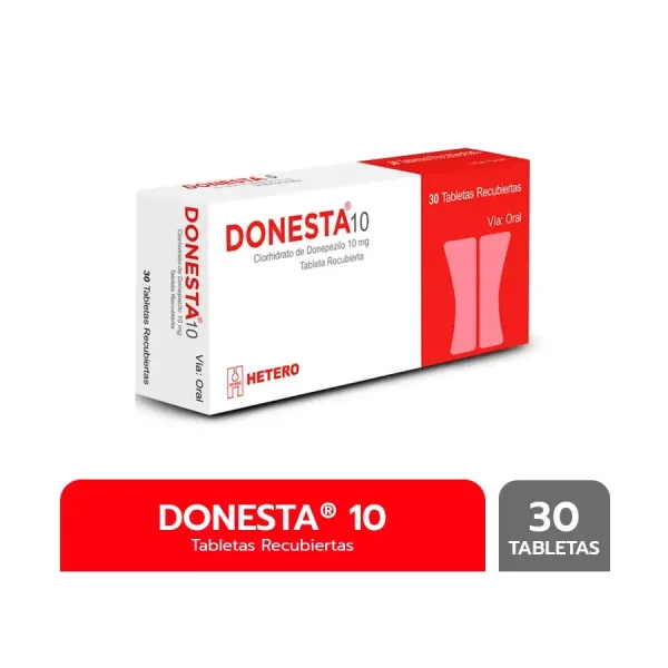 Donesta 10 mg contiene donepezilo, un inhibidor reversible y selectivo de la acetilcolinesterasa, que incrementa los niveles de acetilcolina en el cerebro al inhibir su degradación. Se utiliza en el tratamiento sintomático de la enfermedad de Alzheimer de leve a moderada para mejorar funciones cognitivas, memoria y comportamiento.