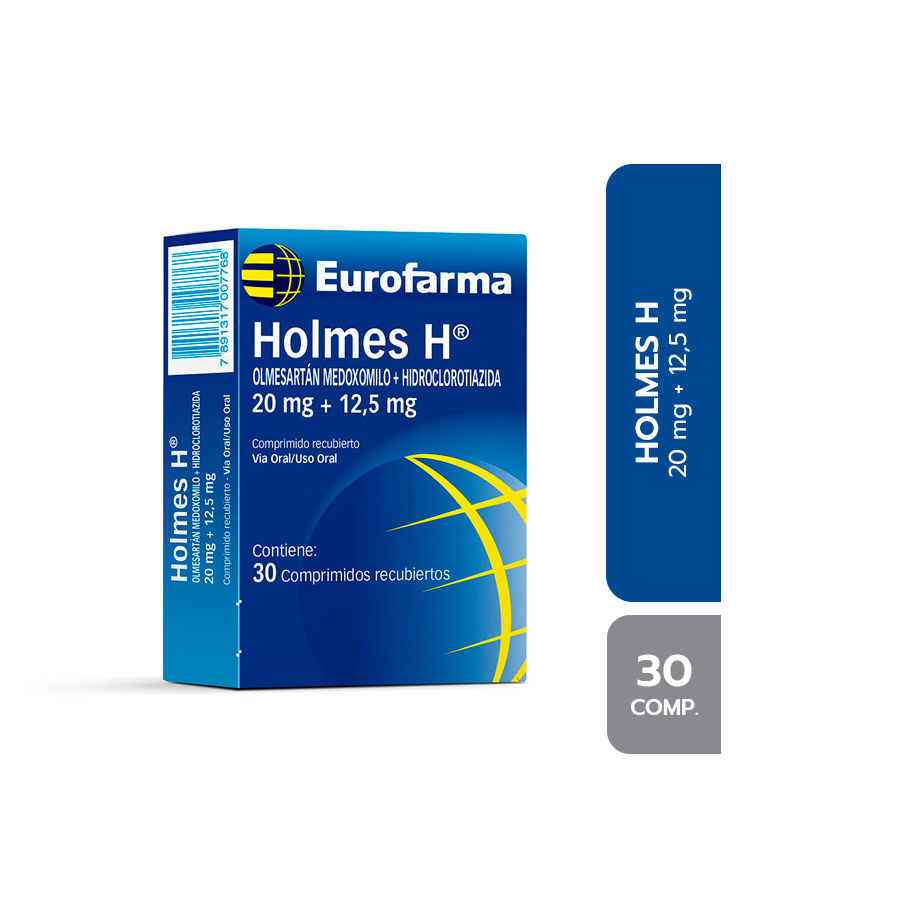 Holmes H 20/12,5 mg x 30 comprimidos recubiertos combina dos mecanismos antihipertensivos: el olmesartán bloquea los receptores de angiotensina II, mientras que la hidroclorotiazida actúa como diurético tiazídico, promoviendo la excreción de sodio y agua. Esta formulación es útil en pacientes que requieren terapia combinada para lograr un mejor control de la presión arterial.