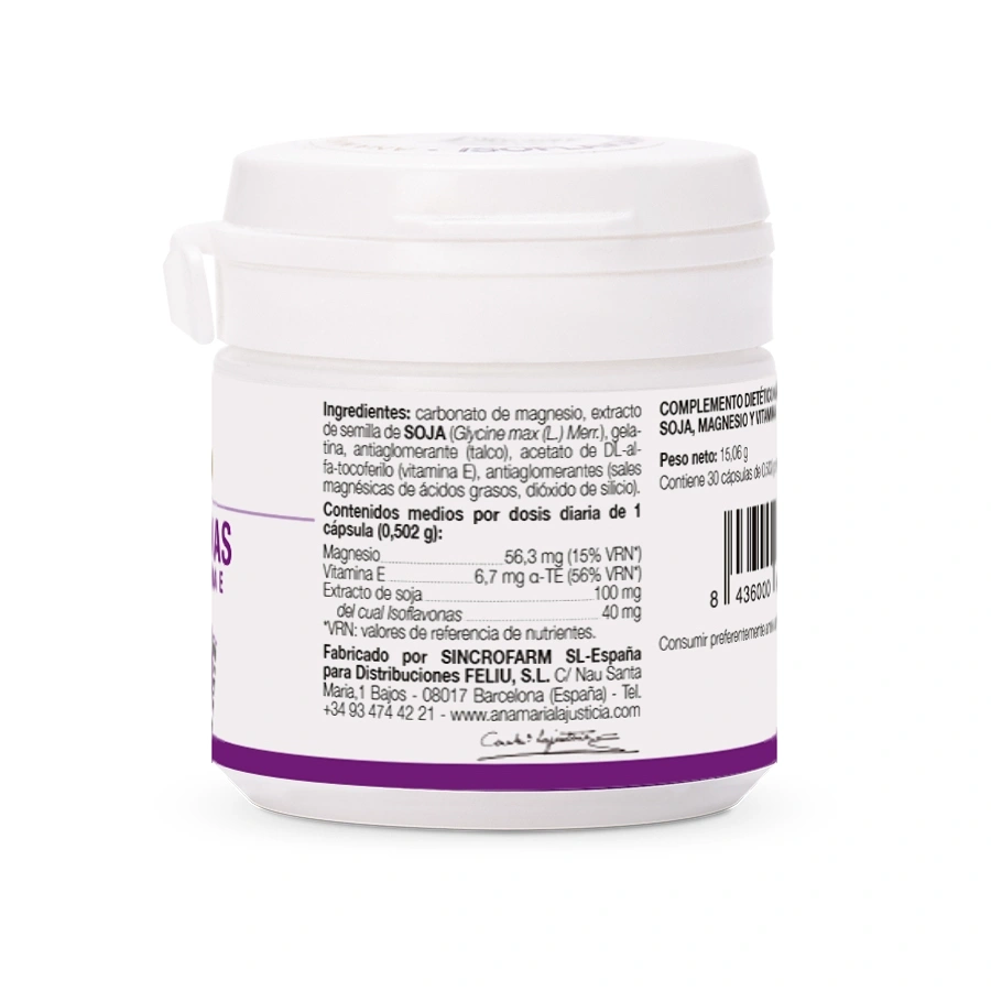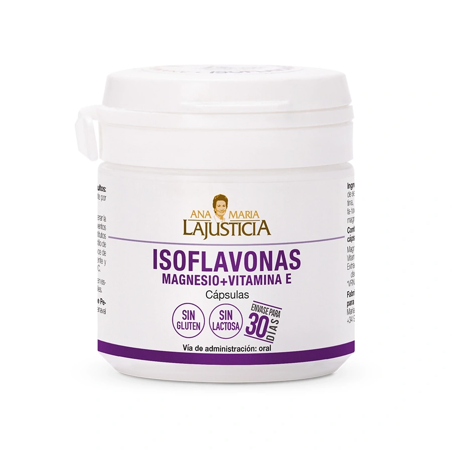 Complemento nutricional en base a Isoflavonas con Magnesio + Vitamina E. Conjunto de sustancias de origen vegetal a las que se les atribuye similitudes funcionales a los estrógenos, por lo que son aconsejables en la menopausia. Es ideal para equilibrar los cambios hormonales típicos de la menopausia y atenuar sus síntomas (sofocos, sudoración excesiva, sequedad de mucosas, ansiedad, entre otros).