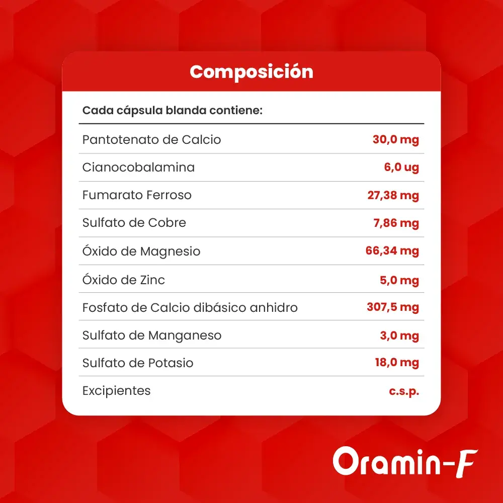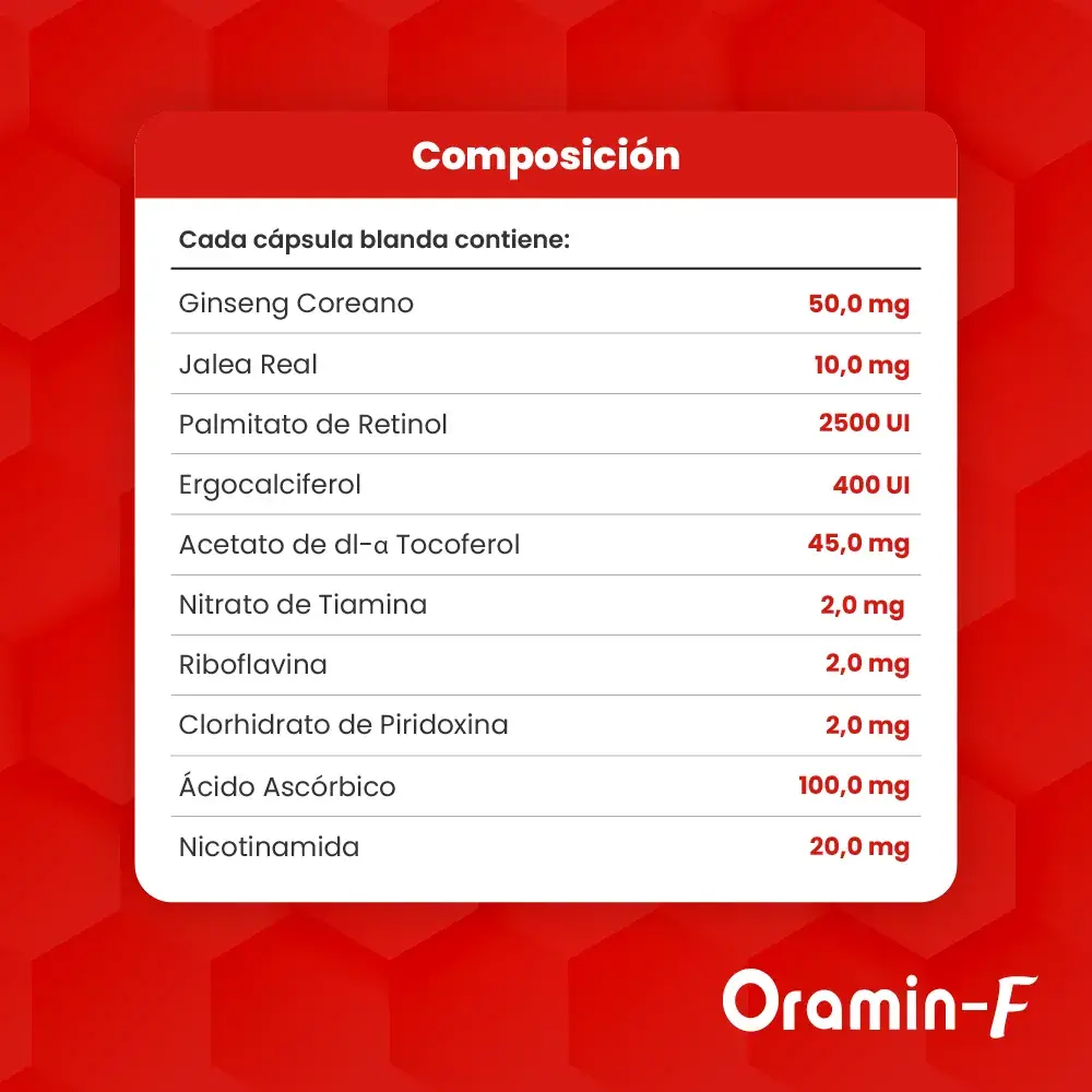 ORAMIN-F es un Suplemento Dietético indicado para Adultos y niños mayores de 12 años 1 cápsula al día, de preferencia con el desayuno.