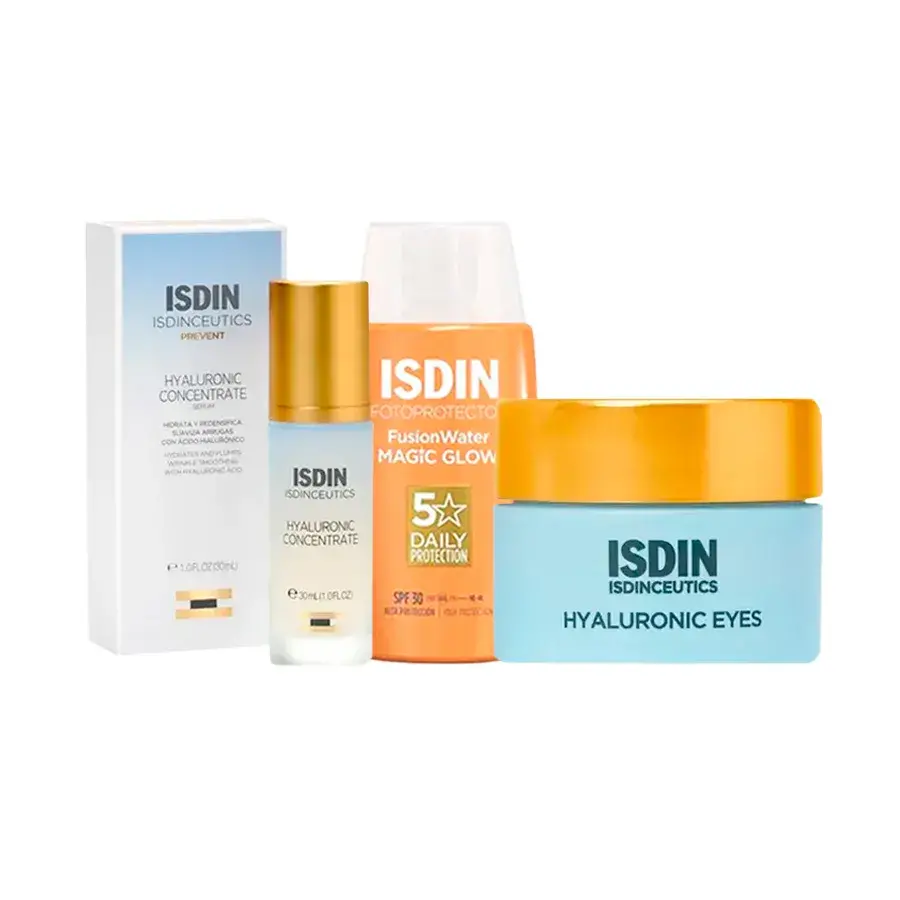 Este pack contiene el Sérum Isdin Isdinceutics Hyaluronic Concentrate (30 ml) y el ISDIN Isdinceutics Prevent Hyaluronic Eyes (15 g), una combinación ideal para hidratar intensamente la piel del rostro y el contorno de ojos. El sérum ayuda a combatir los primeros signos de la edad al proporcionar una hidratación profunda que refuerza la función barrera de la piel, aporta un efecto de relleno que redensifica la piel desde el interior, suaviza arrugas y líneas de expresión, mejora la firmeza, tersura, tono y elasticidad, y reduce la apariencia del poro para una tez más uniforme y luminosa, mientras que el contorno de ojos con ácido hialurónico incrementa la hidratación hasta en un 180% en solo 2 horas, refresca y descongestiona la zona, ayuda a prevenir y reducir las líneas de expresión asociadas a la deshidratación y promueve una mirada más descansada, luminosa y revitalizada.
