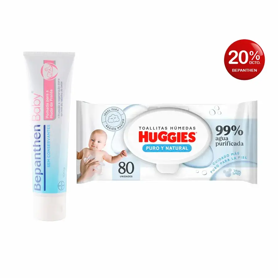 Pack Toallas HumedasHuggies Recien Nacido Bolsa 80 UN + Crema Bepanthen 20% dscto