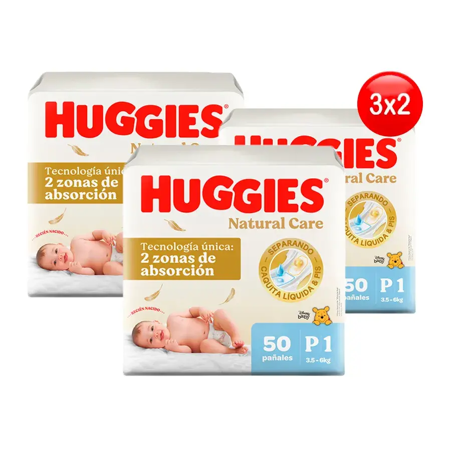 Pañal Huggies Unisex Talla P Natural Care Bolsa 50 UN – 3×2